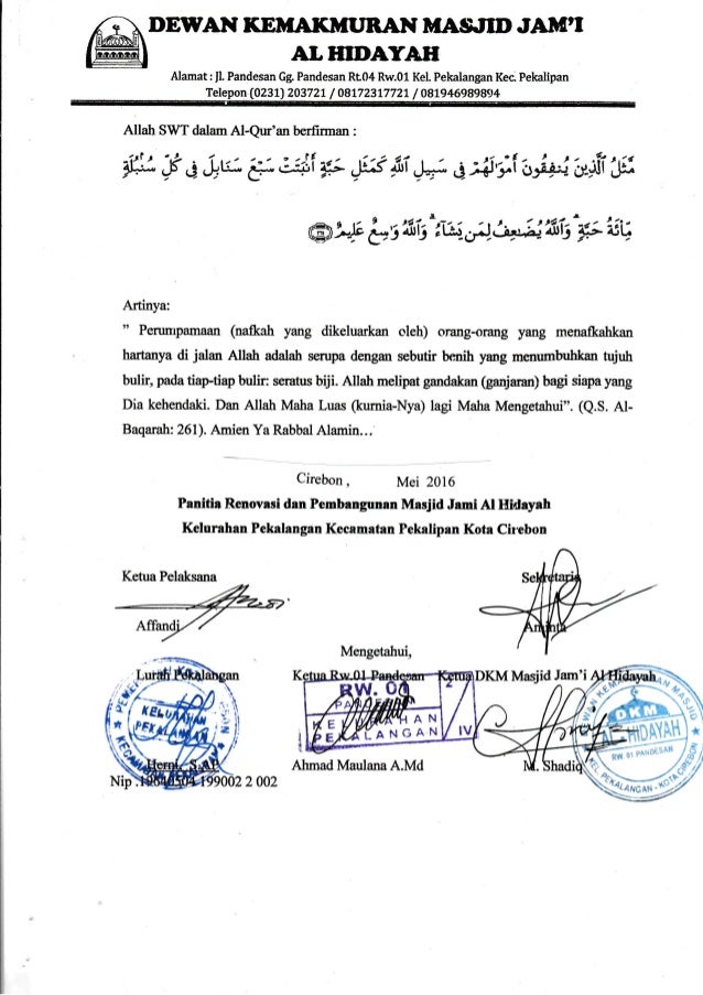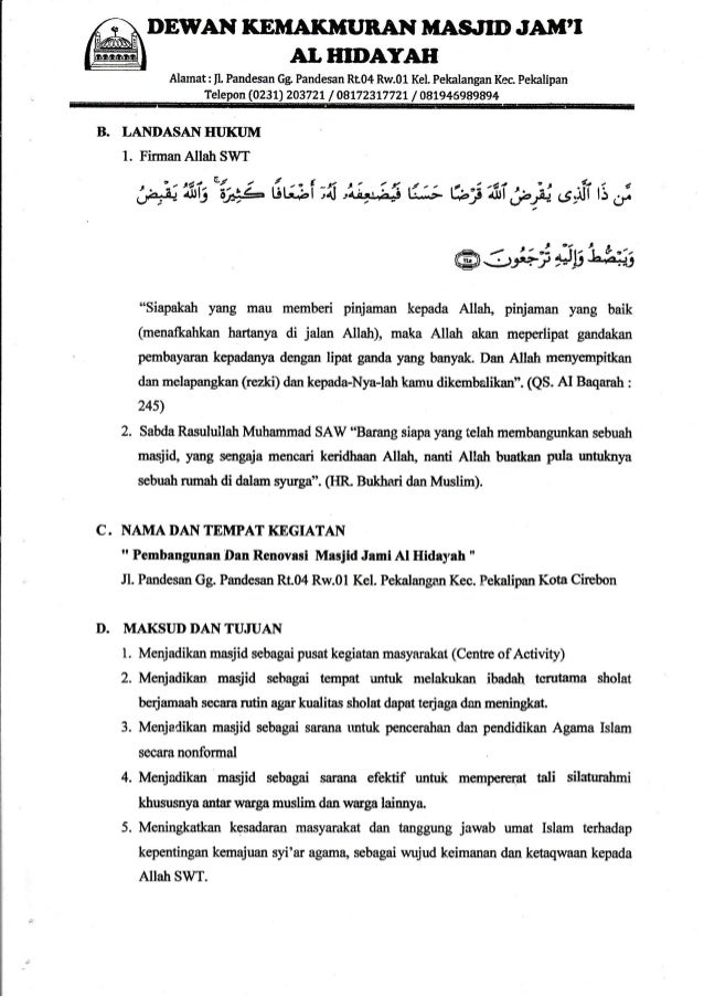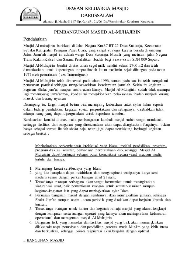 Masjid merupakan sarana beribadah umat muslim. Dalam hal ini juga bemaksud agar dapat melakukan syiar agama islam dan pembinaan mental menuju kebribadian yang ber akhlak mulia. Sumbangan dari swadaya masyarakat 2. Proposal pembangunan masjid baitussalaam pendahuluan latar belakang ~ al baqarah : Tersedianya masjid yang memadai untuk dapat dilakukannya smebayahnya di daerah karang jahe dan sekitarnya, menyediakan pembinaan umay dan sarana pelayanan untuk dapat memahami islam. Pembangunan fisik lebih terlihat oleh kasat mata dan dapat diukur. Untuk dapat menciptakan kuantitas dan kualitas dalam beribadah kepada allah swt ,maka diperlukan rehab fasilitas ibadah atau masjid. Pembangunan mesjid j ami, oleh karena itu k ami mohon kiranya bapak/i bu/sdr./. Sumber dana yang halal dan tidak mengikat Permohonan bantuan rehab masjid kepada yth. Sebagai tempat ibadah, tentunya masjid harus bisa membuat suasana yang nyaman dan bisa menampung umat muslim yang sedang beribadah. Semoga allah selalu memberi rahmat pada kita semua. Shalawat serta salam semoga tercurah kepada junjungan kita nabi muhamad saw.